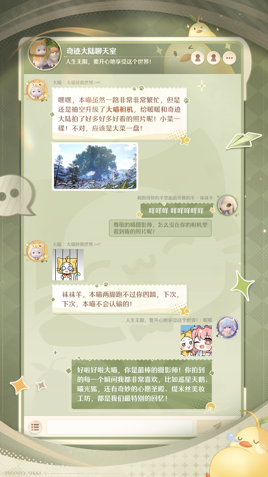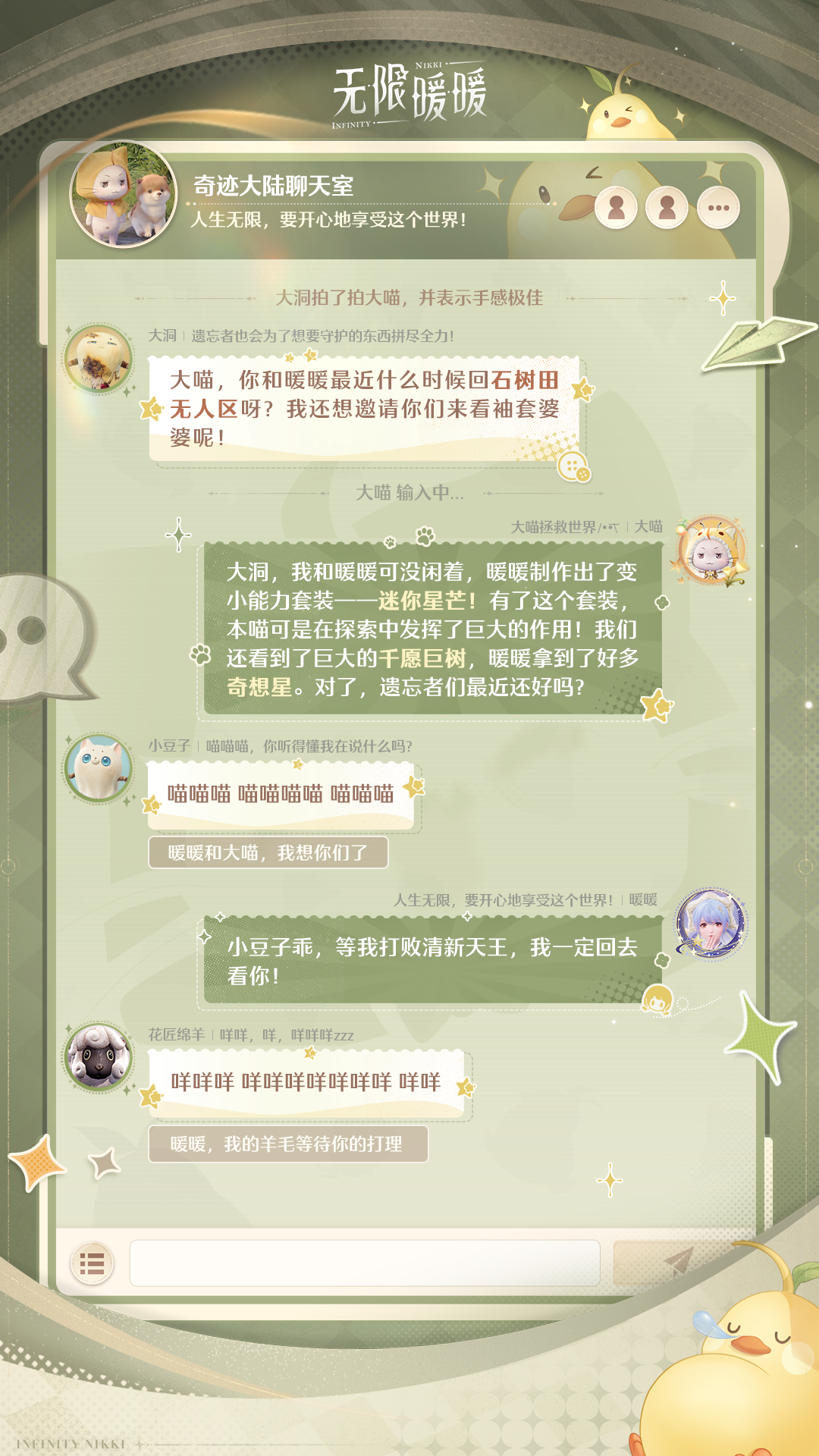 快来看看奇迹大陆聊天室里,暖暖与大喵在和小动物们说什么吧(ノ>ω<)ノ